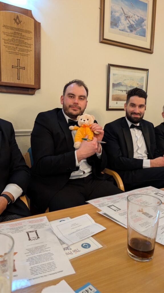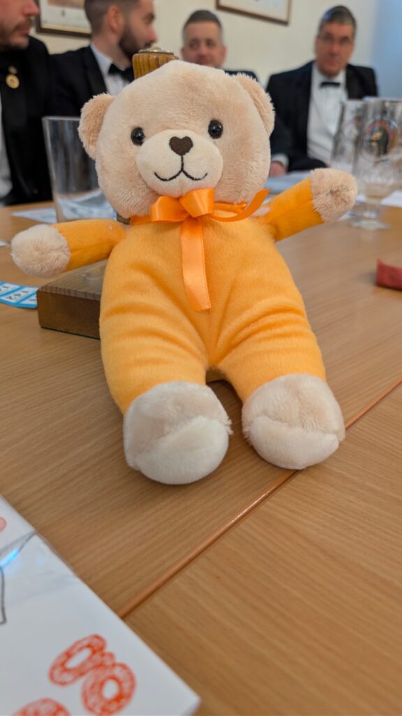 One of the most talked about elements of the evening came during the Festive Board, when W Bro Tom introduced and explained a new charitable initiative. Drawing inspiration from the well known Teddies for Loving Care scheme, the initiative centres on Gold Anxiety Bears, which are given together with colouring books to individuals living with dementia, with the aim of helping to reduce anxiety and provide comfort.